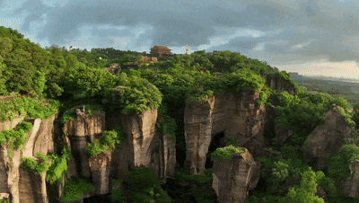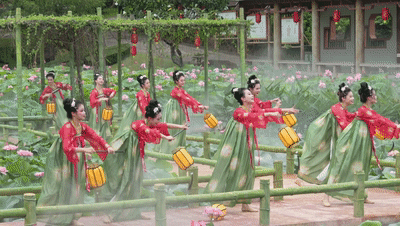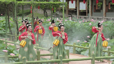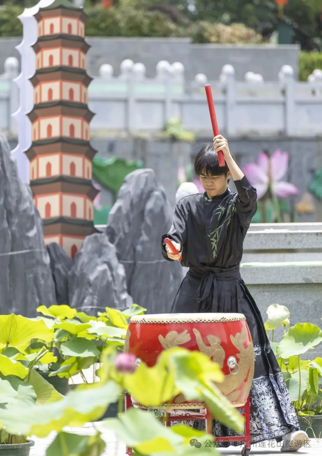 身着古典服饰的“莲花仙子”以快闪形式穿梭于莲花仙境与古采石场,在莲荷氤氲间营造“人在画中游”的浪漫意境。